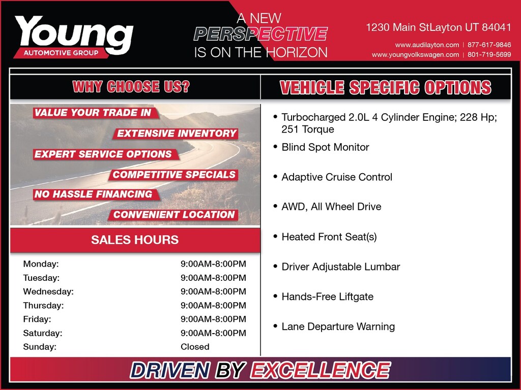 2 Years Young Auto Care includes: Three Oil/Filter Changes | Tire Rotation | Fluid Top Off Multi-Point Inspection | Battery Test | Alignment Check. Please call to schedule your test drive today! Price does not include any dealer installed accessories, please see dealer for details and demonstration. Tax, title, and license fees extra.